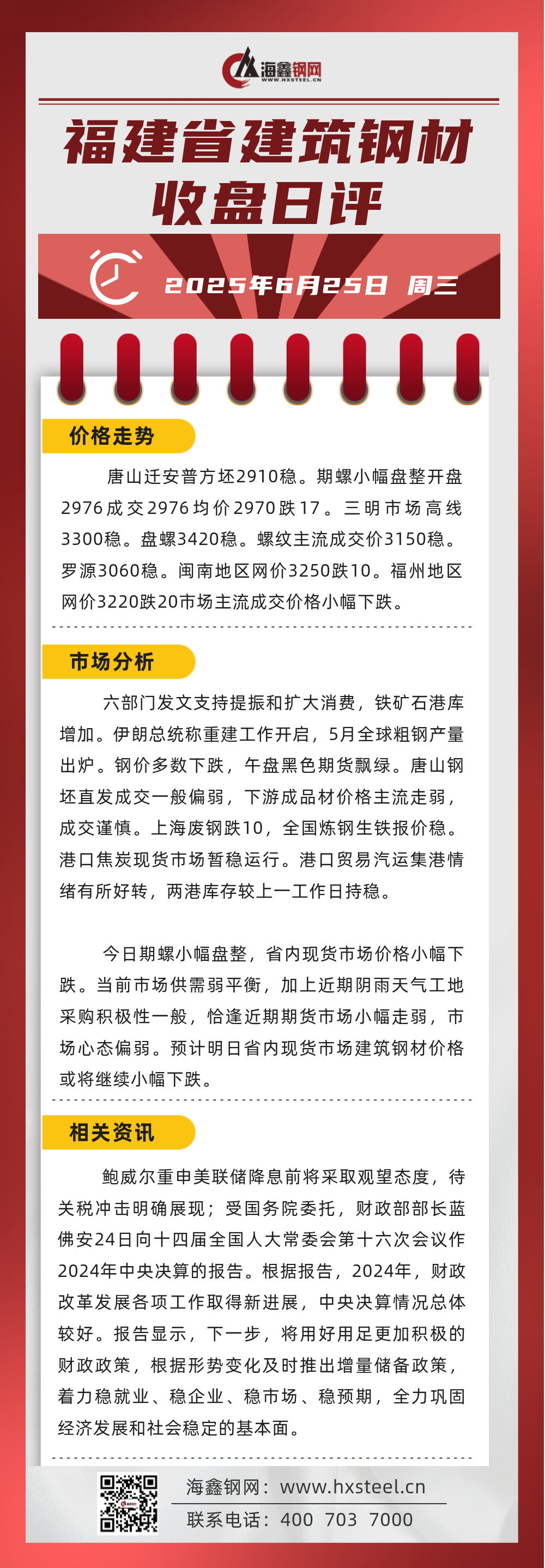 6月25日福建省內建筑鋼材收盤日評