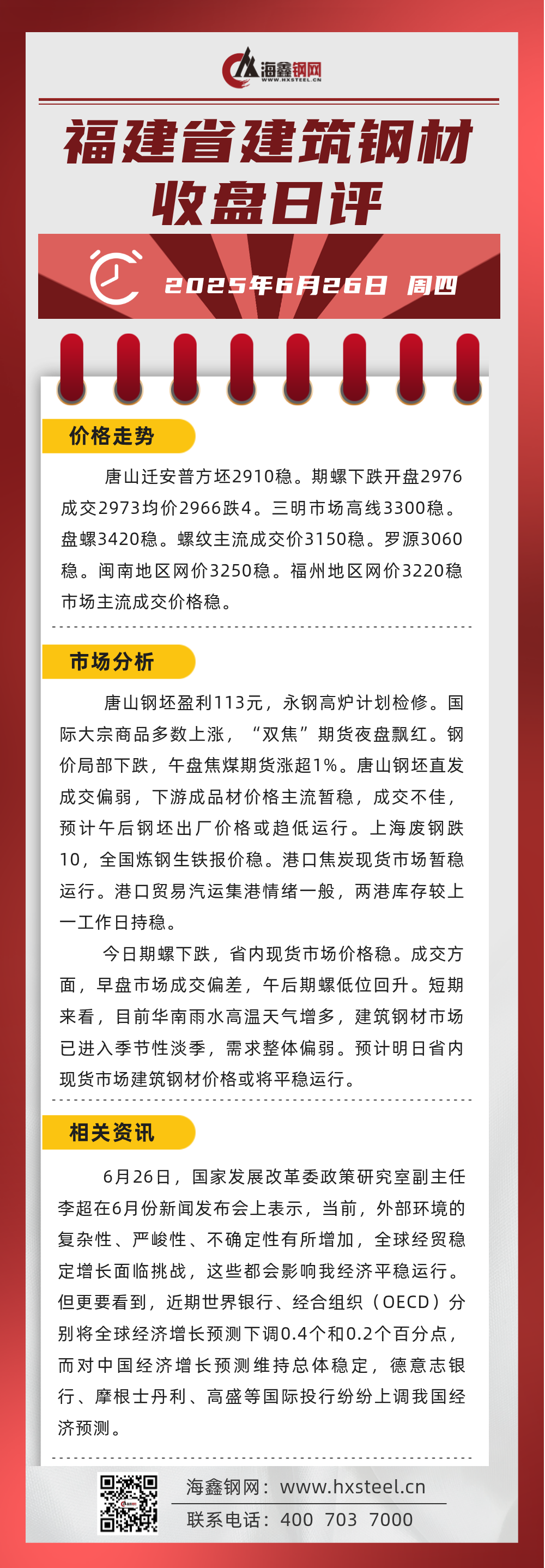6月26日福建省內(nèi)建筑鋼材收盤日評(píng)